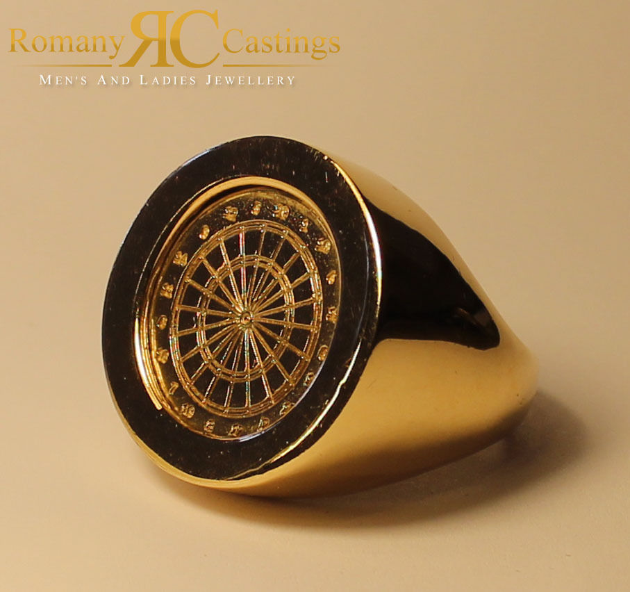 Men’s Highly Polished Dart Board Ring cast in 9ct Gold Ring 33 grams Hallmarked 30 mm (please note that weight will vary slightly depending on finger size required)This stunning Ring with beautifully hand finished details, is cast in 9ct Gold, giving it a warm golden colour. We can offer this item at 50% of the high street price. A perfect gift for any occasion . So now you can treat the person in your life or just treat yourself. (All weights are approximate). The Ring is brand new and will come hand polished in a stylish soft suede gift pouch. Delivery: Please allow 14 days for dispatch as items are made to order. Romany Gold use only first class postage Recorded delivery (UK Mainland only via Royal mail), we are UK based sellers and your item will be dispatched within 14 days of full payment being received. After Care: The best way of take care of your Gold Jewellery is to regularly clean the jewellery with a Gold liquid cleaner. Simply dip your gold item into the liquid for a few minutes and repeat as necessary to help keep your gold jewellery in optimum condition. Please note: Images are not to scale in order to show fine detail. Colour may vary depending on your screen resolution.